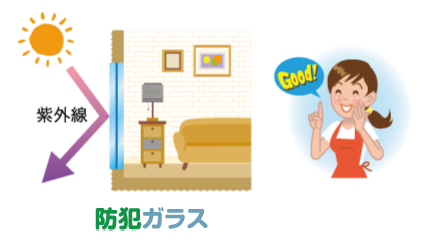 ほぼ100%カット「防犯ガラス」は、中間膜によって太陽光に含まれる紫外線を99%以上カットし、家具や壁面などの色あせを抑えます。