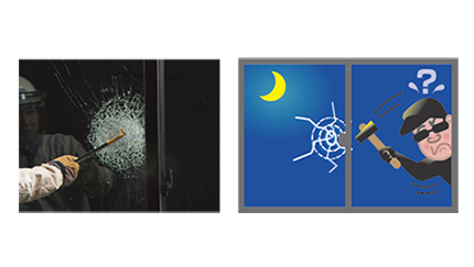 「防犯ガラス」は、特殊な膜の力で外部からの衝撃を通しにくくし、侵入窃盗犯の侵入を阻止します。